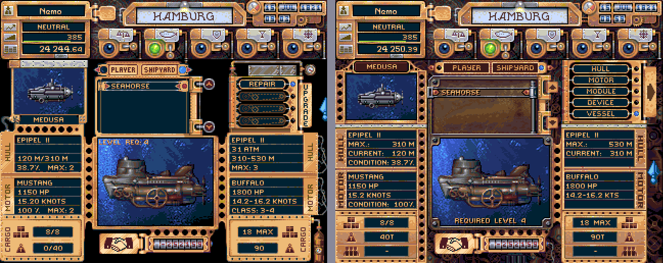 • The repair section does not open a dialogue window with Oleg & Wei (Repair Station) as before. Instead, the player's vessel is displayed in the window and the price to pay for the repair is displayed at the bottom, just like in any other category. Clicking on it will perform the repair immediately.